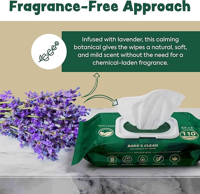 • These lavender dog wipes are infused with soothing and moisturizing ingredients like lavender, shea butter, vitamin E, coconut oil, and aloe making them perfect for dogs with sensitive skin.