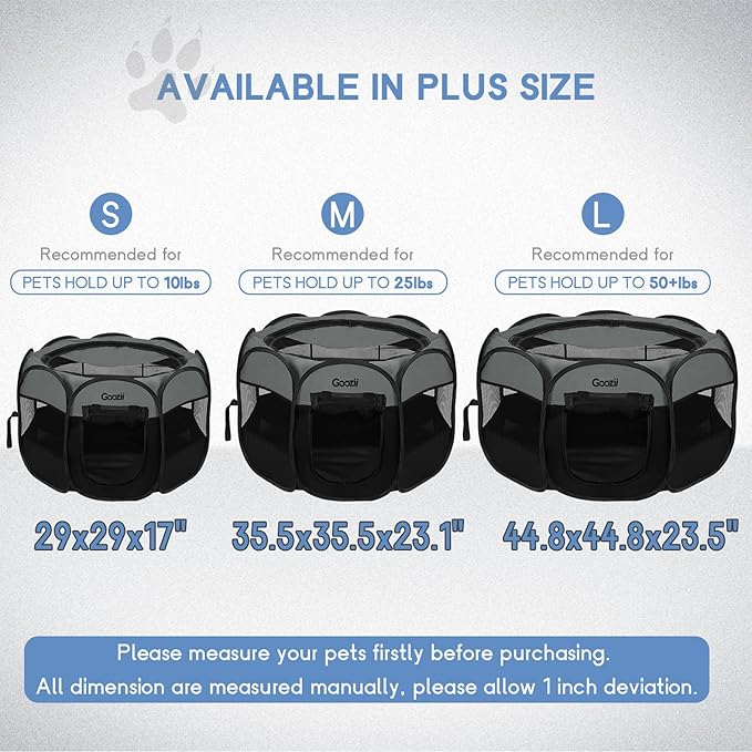 • 【Spacious & Comfort】: This dog playpen keeps your pet stay in this pet pen secure, spacious interior give more fun for your pet. Size is 35.5*35.5*23.1 inches, great for small animals up to 25 LB. There are 1 inch error range because of technical issue.