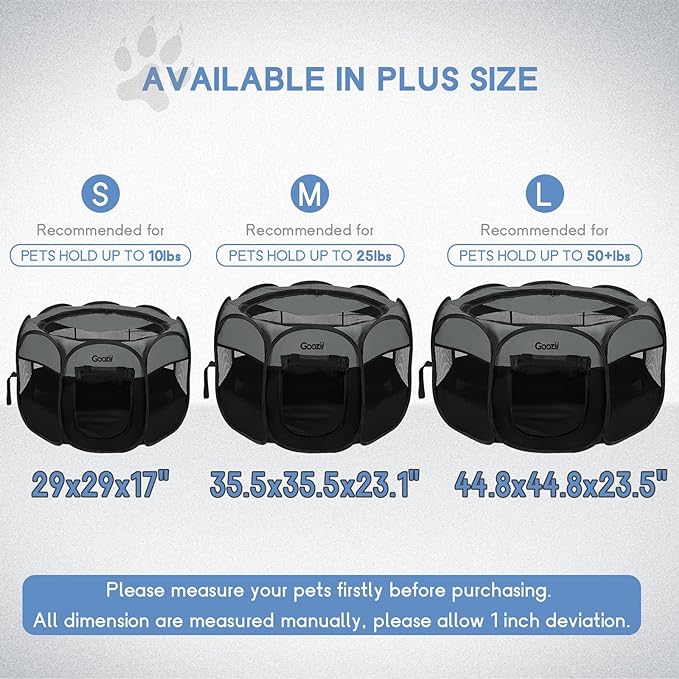 • 【Spacious & Comfort】: This dog playpen keeps your pet stay in this pet playpen secure, spacious interior give more fun for your pet. Size is 44.8*44.8*23.5 inches, great for small pets up to 50 LB. There are 1 inch error range because of technical issue.