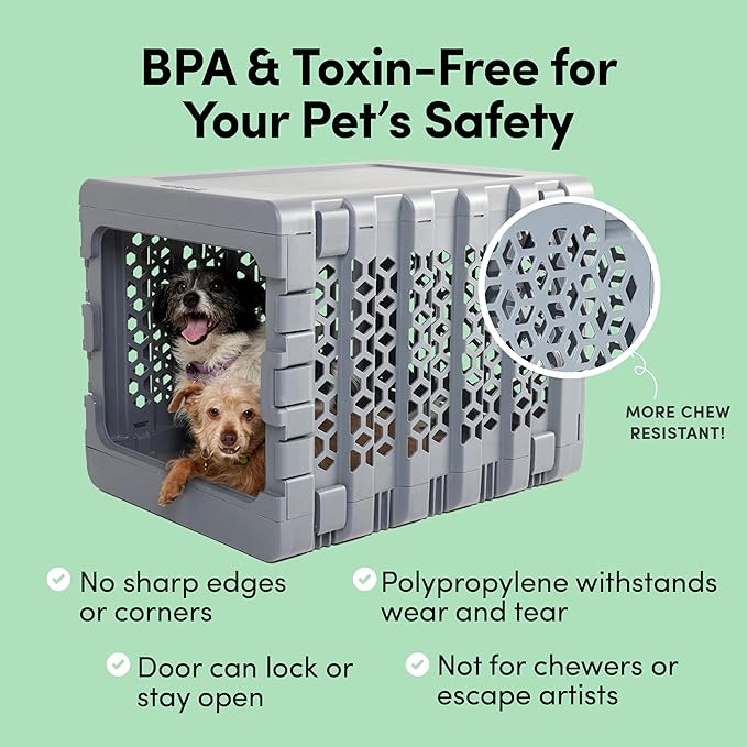 • MADE FOR PET AND PAWRENT SAFETY - Our hard plastic dog crate is constructed of BPA-free, non-toxic polypropylene that withstands daily wear and tear. There are no sharp edges, or corners, and the door can stay open or lock as needed (not for escape artists).