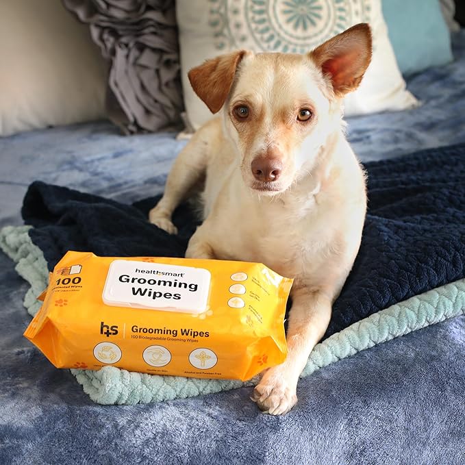 HealthSmart Dog & Cat Grooming Wipes, Alcohol and Paraben Free, Gentle on Skin, 100% Biodegradable, 100 Count, Deodorizing, Great for Paws, Ears, and Butt