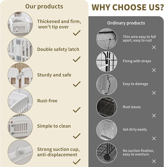 • SECURE AREA: Give your pet an entertainment space that belongs to it.Pet playpen tall enough for a small pet to reach into the enclosure, puppy playpen keeps your pets safe from others.Our pet fence is made of safe, high-quality plastic, and is artificially trimmed, smooth and burr-free, so You don’t have to worry about your pet getting hurt.