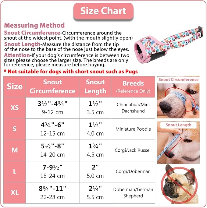 • Dog Muzzle for Large Dogs-Size L is suitable for snout circumference between 7" and 9½", and snout length that is greater than 2”. Please measure twice before buying. The large dog muzzle is fit for Doberman, Corgi, Beagle, and so on. If you have any problems with sizing, we are happy to help you.