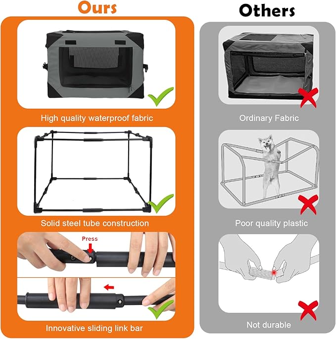 • 【Sturdy Steel Tube Material】: Folding soft dog crate is designed with sturdy and lightweight steel tubes, which can be folded/unfolded quickly, and innovative steel tube link design, which can be used to limit the position of the steel tubes when pushing them in after holding down the iron ingot