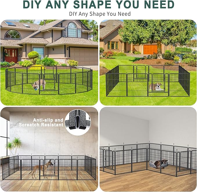 • 【Pets Ideal place】The size of gate of the pet fence is 32"H x 26"W.16 panels can be assembled into different shapes about 81 square feet according to needs. It is an ideal and safety place for large, medium and small animals.Suitable for indoor and outdoor.
