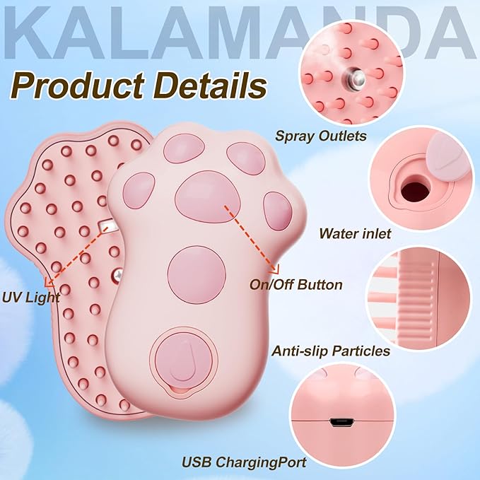 Cat Steam Brush for Shedding, 4 in 1 Steamy Cat Brush Cleanser, Dog Massage Grooming Brush with Release Button, Pet Hair Cleaning Misting Comb for Kitten(Pink Paw)