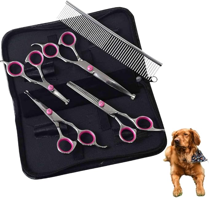 Professional 5 in 1 Dog Grooming Scissors Set with Safety Round Tips, Japard Sharp and Heavy-duty Pet Shears for Cats (Pink)