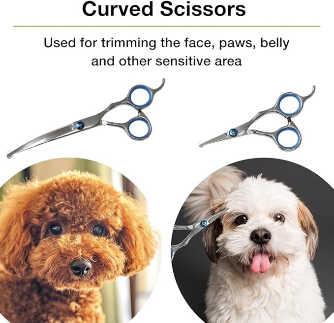 • Home Barber When Needed: Curved scissors Left / Right are suitable for cutting hairs of face, paws using its curved line to have natural cut and the comb is needed to tease out the tangled knots in pet’s hair before start to cut