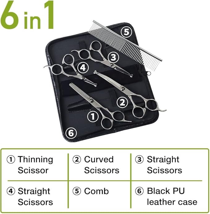 • 5 in 1 Home Barber Set: The kit includes 1 × 6.7 inch thinning shear, 1 × 7.4 inch curved scissor, 1 × 6.3 inch straight scissor, 1 × 5.1 inch straight scissor, 1 × 7.5 inch pet comb, 1 × black PU leather case
