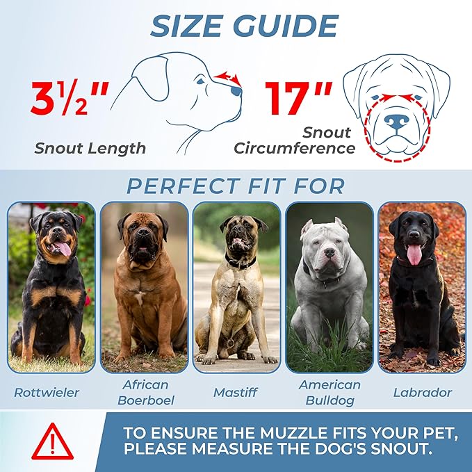 • XL Metal Dog Muzzle: Before buying a basket muzzle for large dog, measure the dog's snout. Aim for a circumference of 17 inches and a length of about 3½ inches to ensure a comfortable and secure fit.