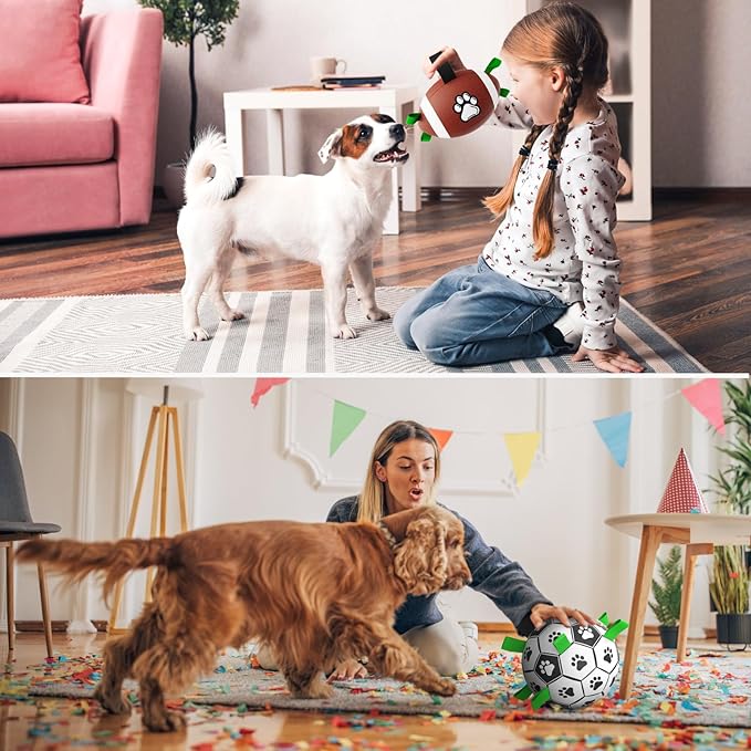• What you Get: 1*dog soccer ball, 1*dog football, 1*pump adapter, 1*instruction. Both soccer ball and football are made of premium PU, complying with the exact same standard as children's toys, can be kicked and bounces well, suitable for all breed sizes dogs
