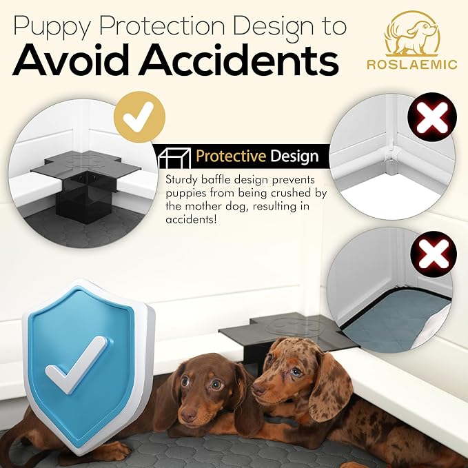 • Sturdy and Clean - Roslaemic welping box is made of Pet-friendly plastic. The 19-inch-tall dog whelping pen has internal dimensions of 48 x 48 inches. Installation takes only five minutes and no tools are required.