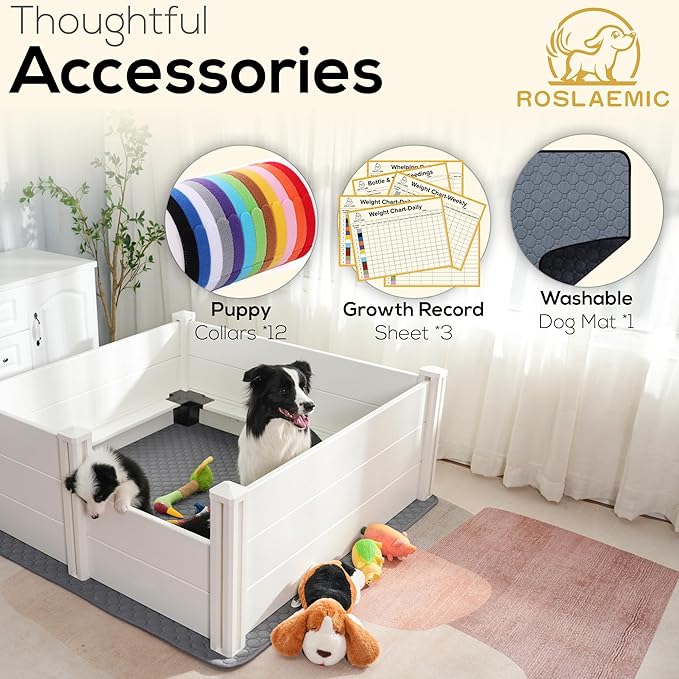 • Includes Puppy Whelping Supplies - Package additionally includes 50*50in washable puppy mat *1, puppy collars *12 and growth charts *3.