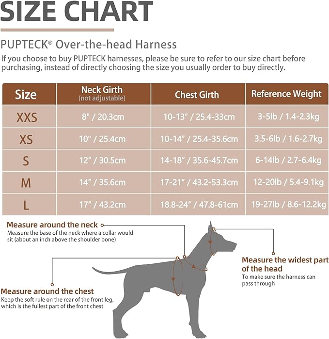 • SIZE GUIDE: [XS: Neck 10", Chest 10"-14"], [S: Neck 12", Chest 14"-18"], [M: Neck 14", Chest 17"-21"], [L: Neck 17", Chest 18.8"-24"]. Sizing does NOT directly correspond to your pet's breed or weight, and do NOT order the usual size directly, please always measure your dog and refer to our brand size chart! [ATTENTION]: The neck is not adjustable, please make sure your dog's head can through the harness