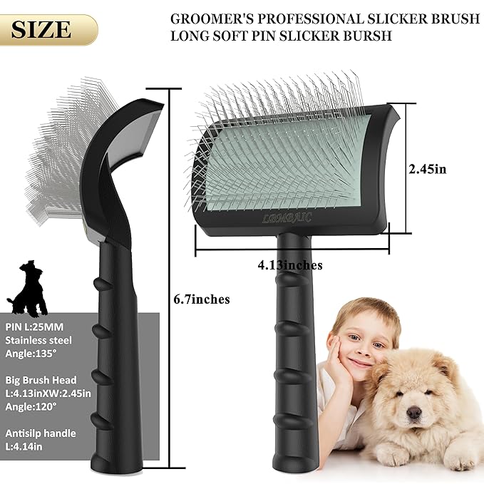 • 【120° Big Unique Curved Handle Design Easier To Use.】- Large contact surface Increase the area of contact with pet hair during grooming.120°curved surface conform to grooming habits save time and energy. Extra long pin slicker brush size is suitable for small medium large dogs or cats with thick or long hair.This multi-purpose slicker brush for loosing undercoat hair long,straight,curly,thick,shaggy.