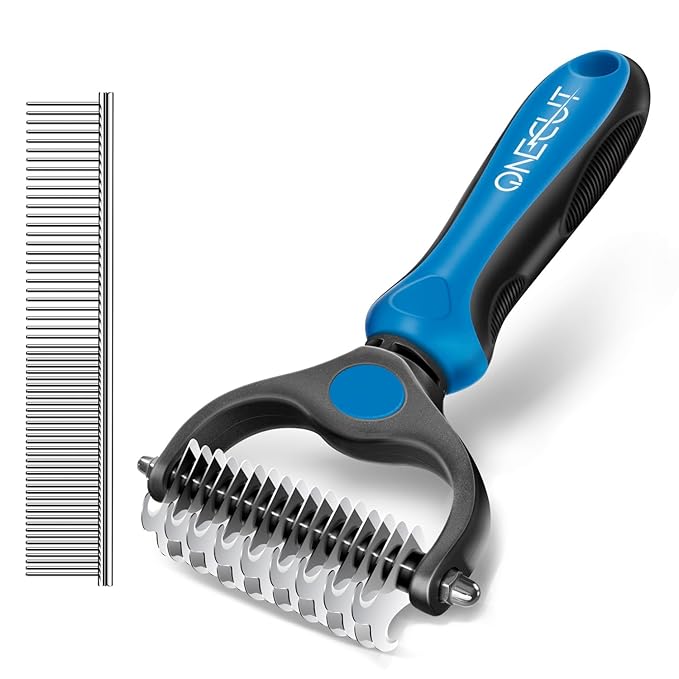 OneCut Pet Grooming Brush and Metal Comb Combo, Pet Grooming Rake and Brushes for Small, Medium & Large Dogs Double Sided Deshedding Tool Removes Knots and Tangled Hair (Blue)
