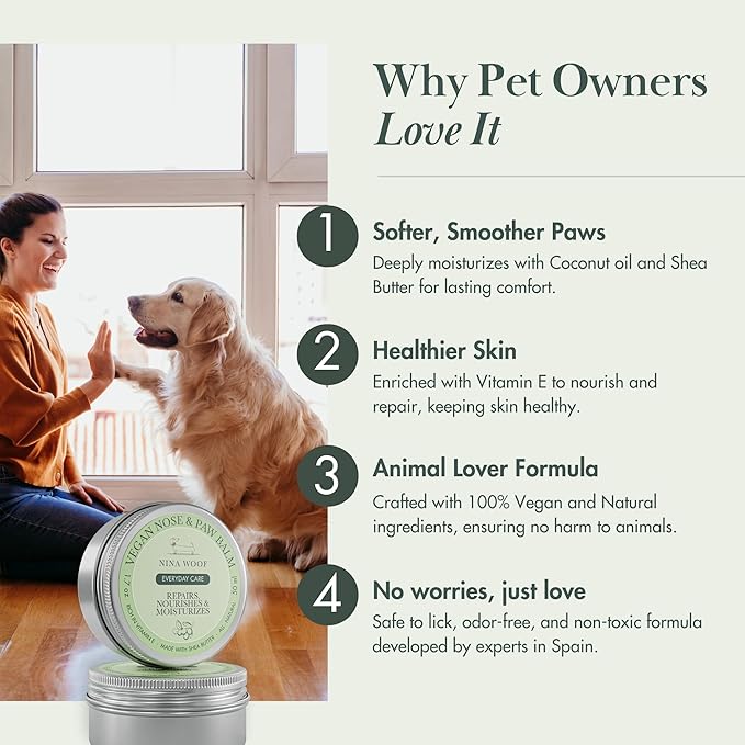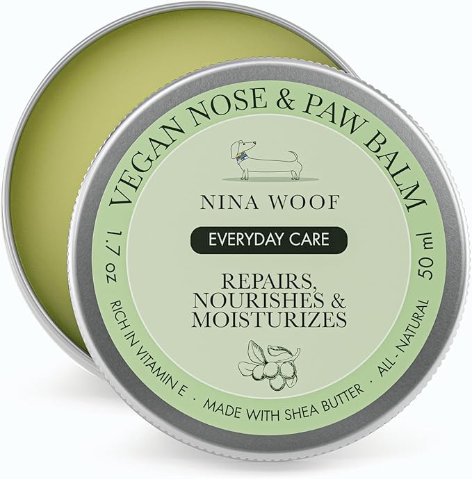 • All-Natural Vegan Nose & Paw Balm: Our dog nose balm for dry nose and paw balm is crafted with vegan ingredients. It's rich in Vitamin E, providing deep nourishment and healing properties for your pet's sensitive skin.