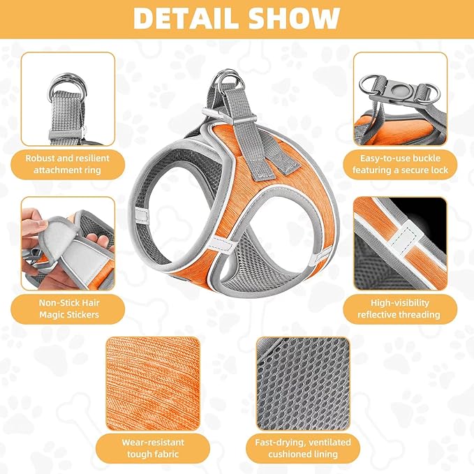 • 🐕‍🦺Comfortable and Reflective --- Small dog harness features breathable Jacquard fabric,this durable, dirt-resistant fabric enhances comfort and maintains its vibrant color. Reflective strips deign reflect ambient light in low light conditions, making you and your dog safer when walking and moving around at night without worrying about blurred vision in the dark.