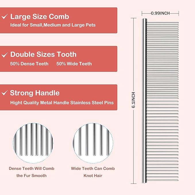 • STAINLESS STEEL COMB 2-IN-1 DESIGN - Sparse teeth to loosen tangled hair & comb large fluffy hair, also can be styled for dogs; dense teeth to comb eyes ears, nose & fine hair on legs; rounded pins with smooth stainless steel to effectively prevent static electricity & tangled hair when combing.