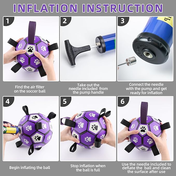 • ⚽Pump & Needle Adapter Included: The herding balls for dogs come deflated. There's a needle point adapter and a pump inside as well while other items in the same market only include a ball needle. The soccer ball dog toy is 8 inches in diameter, perfect for large breeds, not for aggressive chewers.
