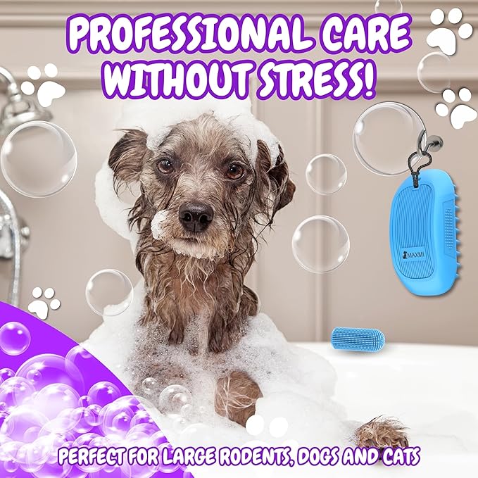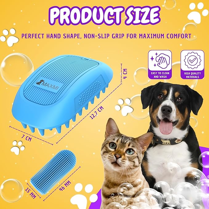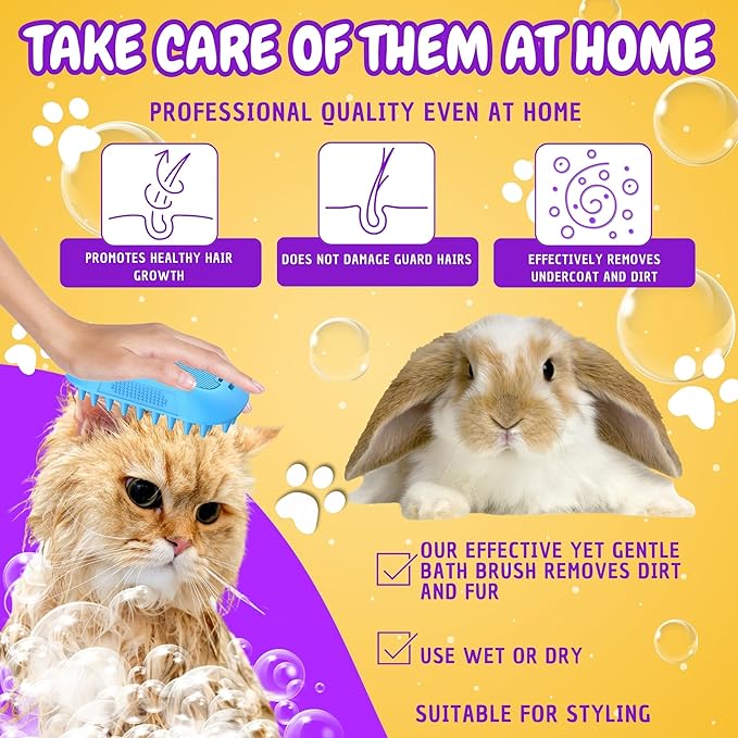 • 🐶【Easy Cleaning & Deep Scrubbing】- the dog shampoo brush offers a deep clean, removing dirt and loose hair. Designed to fit both long and short haired dogs. Soft silicone tips provide a soothing massage that stimulates circulation, promoting skin and coat health without damaging your pet's skin.