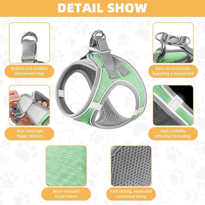 Dog Harness with Leash Set, Adjustable Soft Mesh Padded Reflective Dog Harnesse, Dog Leash with Soft Padded Handle, Puppy Harness and Leash Set for Walking,Training - Green, XS
