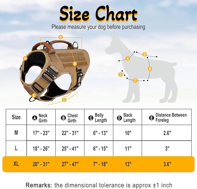 - [Dog Harness for Medium Large Dogs] - A professional tactical dog harness has 5 adjustment locations to allowing you to achieve a secure and comfortable fit for your dog's body shape. Neck Girth: 20”- 31” (51 - 79cm), Chest Girth: 27”- 47” (68 - 120cm), Back Length: 13”(33cm).Please refer to our size chart, make sure match up your dog's measurement