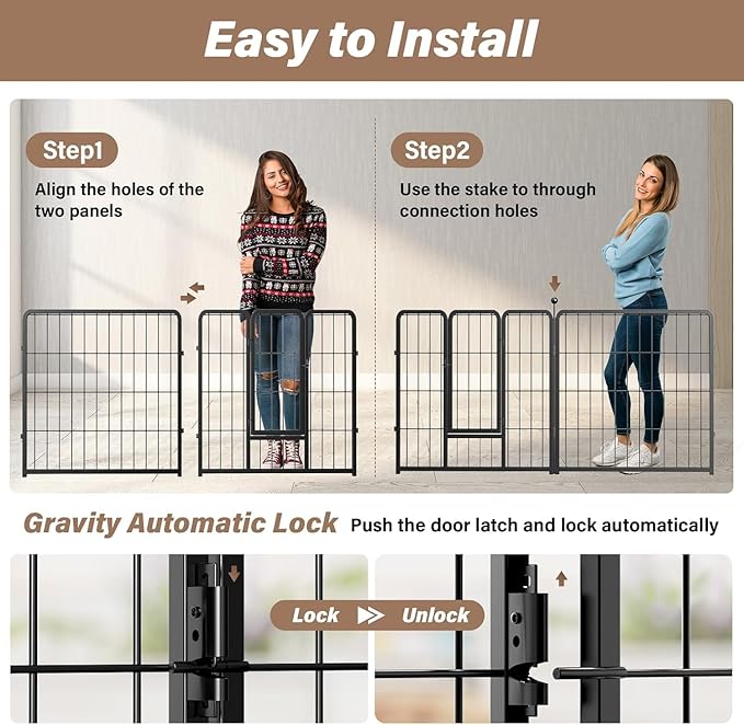 • 【Convenient for Dogs to Enter and Exit】This indoor dog playpen is designed with rounded ball tops to protect the dog's claws from injury. The gravity door lock ensures you can open and close the door easily. Dog play pen is designed for safety.