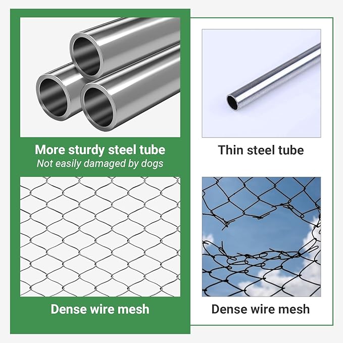 • Lockable Door:This metal outdoor kennel with a lockable door will keep your pets safe from predators and other dangers outdoors. Please note: When installing the fence, please pull it tight enough to make it stronger and avoid gaps.