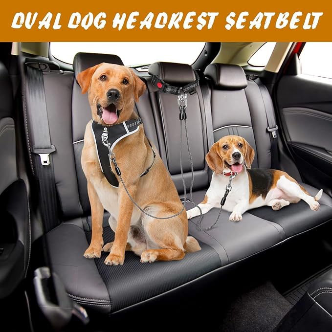 Double Dog Seat Belt, Steel Cable Chew Proof Dog Car Accessories Headrest Restraint Dog Car Seatbelt for Medium Large Dogs Chewer Heavy Duty 2 Dogs Dog Seatbelts Connect Harness in Vehicle