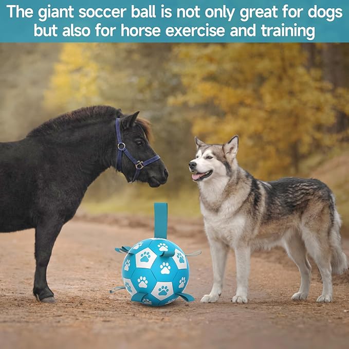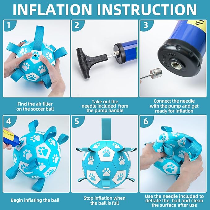 • ⚽Pump & Needle Adapter Included: The herding balls for dogs come deflated. There's a needle point adapter and a pump inside as well while other items in the same market only include a ball needle. The soccer ball dog toy is 9 inches in diameter, perfect for small medium breeds, not for aggressive chewers.