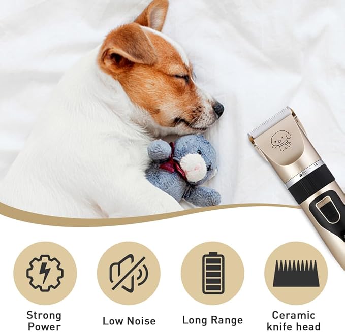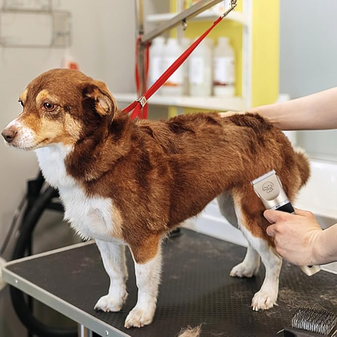 • 【Low Noise】Utilizing a full metal body, our dog clippers offer lower noise and vibration compared to common plastic models on the market. The metal construction reduces vibration, thereby minimizing noise levels to under 50dB, so your pet won't get scared and you'll be able to trim its coat with ease and much faster, Ideal for noise sensitive dogs.
