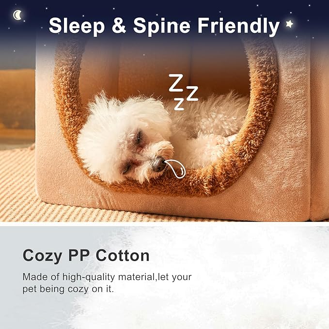 JIUPETY Cute Small Dog House Indoor, Foldable House Kennel Bed Mat with Cushion, L Size Tent Up to 30 Lbs, Dog Cave Bed with Non-Slip Bottom, Brown