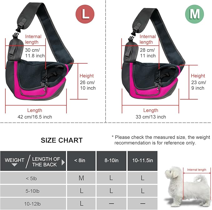 • SIZE AND PETS --- WEIGHT LIMIT 12lbs. The size of this dog carrier is suitable for small dogs, such as Cats, Chihuahua, Yorkshire Terrier, Pomeranian, Mini Poodle, Miniature Schnauzer, Teddy cups etc. Please measure your pet's weight and size before purchasing, and refer to our size chart, this may provide a good help for you to choose our pet carrier sling bag.