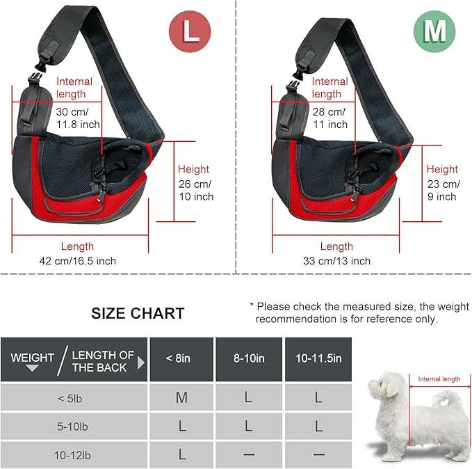 • SIZE AND PETS --- WEIGHT LIMIT 5 lbs. The size of this dog carrier is suitable for small dogs, such as Cats, Chihuahua, Yorkshire Terrier, Pomeranian, Mini Poodle, Miniature Schnauzer, Teddy cups etc. Please measure your pet's weight and size before purchasing, and refer to our size chart, this may provide a good help for you to choose our pet carrier sling bag.