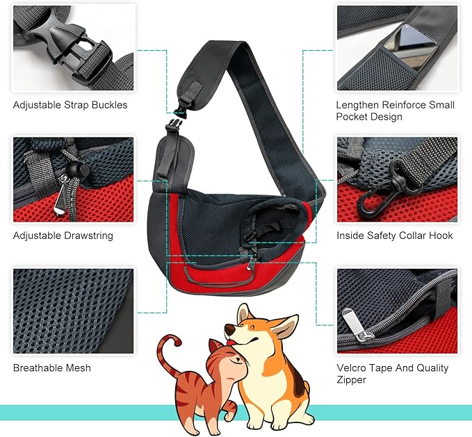• SAFE AND CONVENIENT --- A safety buckle on the inside of the pet sling carrier (it can be connected to a collar) to prevent pets from jumping out. Magic sticker prevents the zipper from slipping and effectively increases safety. The firm buckle design on the shoulder strap is convenient to use and prevents the bag from being disconnected during use.
