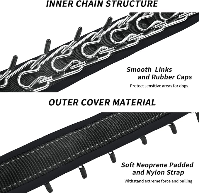 • 🐾【Strong & Durable Material】The inner chain of No Pull Dog Collar is made of stainless steel links, rust-proof and waterproof. Outer cover design with Full Surround Soft Neoprene Padded and Nylon Strap, which can withstand extreme force and pulling power. Combination of two layers adds extra safety to prevent Anti Pull Dog Collar from falling apart, more sturdy and durable.