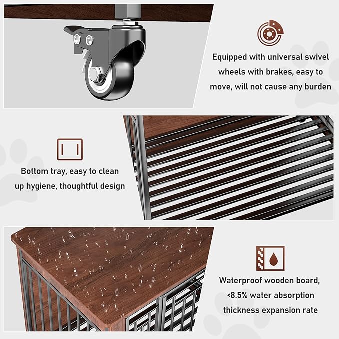 • SPECIAL DESIGN AND STYLE of DOG KENNELS : Because of the wheels, you can move this puppy crate anywhere, indoors or outdoors. And there is a buckle design on the wheels, you can lock them to keep the dog crates for dogs fixed. There is a tray at the bottom of the dog house with door to collect the dog's excrement and avoid dirtying the house. You also can put pet supplies on the top of the dog crate furniture for small dogs.