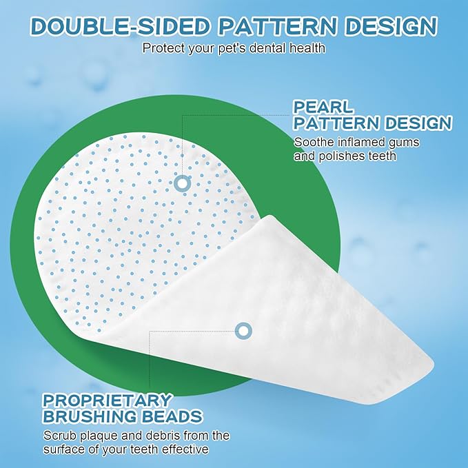 • Dual-Action Plaque And Tartar Remove:Our pet dental finger wipes are designed with double-sided.On one side is pearl pattern design that can soothe inflamed gums and polishes teeth.Another side is proprietary brushing beads that scrub plaque and debris from the surface of your teeth effective.
