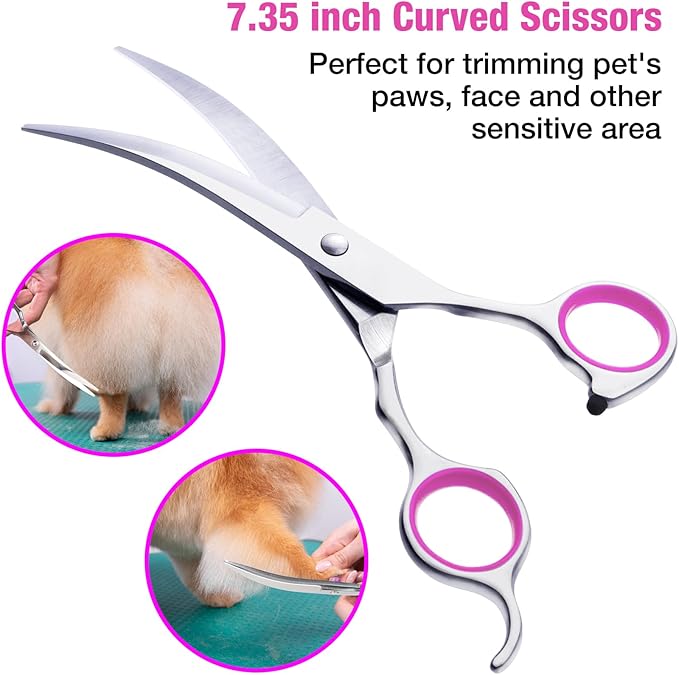 • Professional Pet Grooming Scissors Kit: We use leather waterproof case include 1 X 7.35" curved scissors, 1 X 6.7" thinning scissors,1 X pet comb. Our dog grooming scissors are longer than others, you and your pet will a more comfortable experience