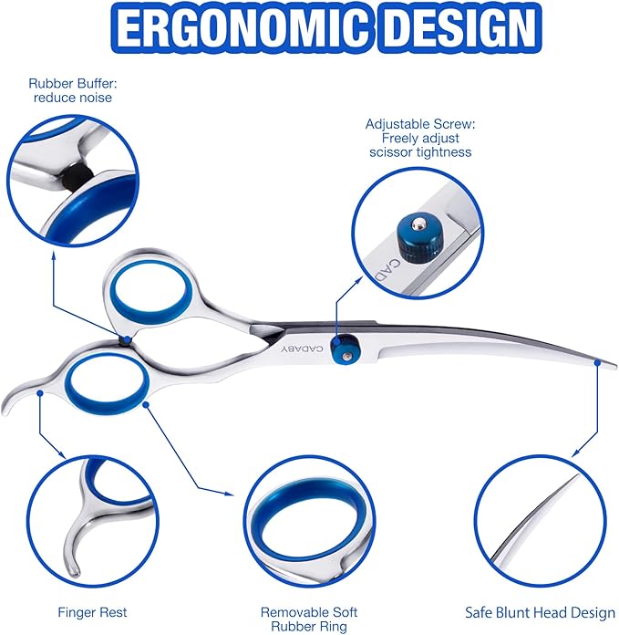 • Ergonomic Design: CADABY dog scissors for grooming are comfortable to hold by right hand. A rubber bumper at the handle which can reduce noise during trimming and keep your pet won't frightened. Our dog scissors equipped a adjust screw,you can adjust the tightness of the scissors according to your personal feeling. Very convenient