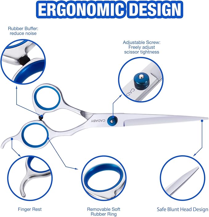 • Ergonomic Design: CADABY dog scissors for grooming are comfortable to hold by right hand. A rubber bumper at the handle which can reduce noise during trimming and keep your pet won't frightened. Our dog scissors equipped a adjust screw,you can adjust the tightness of the scissors according to your personal feeling. Very convenient