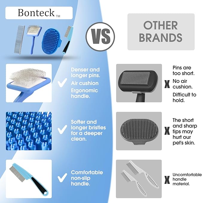 • ALL-IN-ONE DOG GROOMING SET: Elevate your pet care routine with our top-tier Dog Brush Grooming Kit. This comprehensive four-piece set includes a superior dog grooming brush, a durable metal comb, a soothing bath brush, and an effective flea comb. Ideal for all medium to long haired breeds, ensuring a meticulous grooming experience.