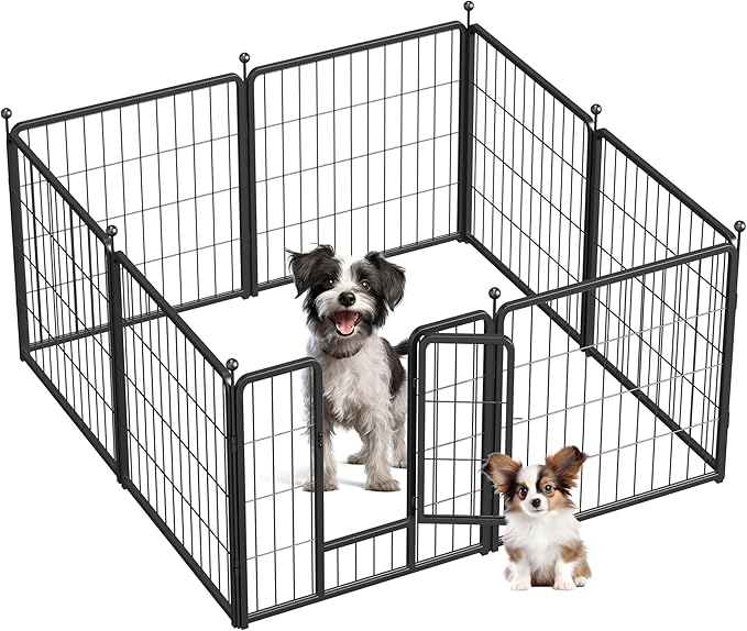 • 【Upgraded Dog Playpen】Playpen dog for medium dogs adopts gravity door lock design, much safer and more convenient. Made of heavy duty metal panels and stakes with black coating, non-toxic, anti-rust. Ensures long time use no matter indoor or outdoor.