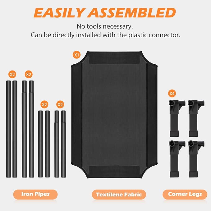 • Easy to Install: The cooling dog cot can be installed without the use of any tools, screws and can be installed directly with the plastic connector. It only takes a few minutes of your time, and presto! It's up and ready for your pet to enjoy in.