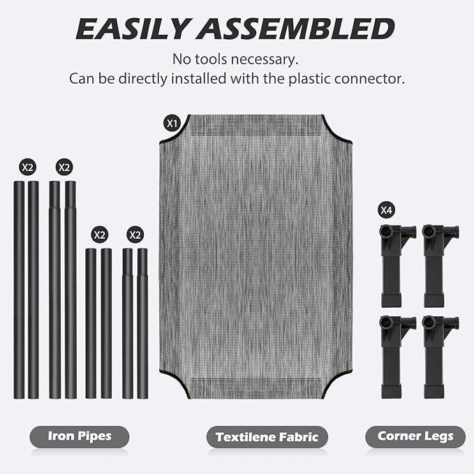 • Easy to Install: The cooling dog cot can be installed without the use of any tools, screws and can be installed directly with the plastic connector. It only takes a few minutes of your time, and presto! It's up and ready for your pet to enjoy in.