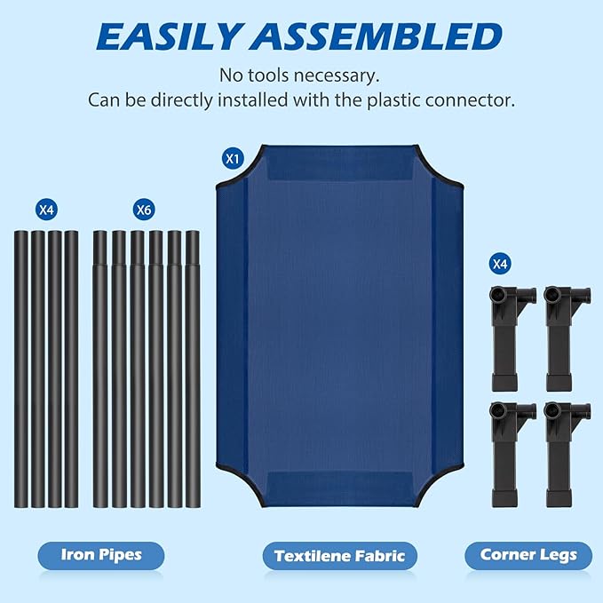 • Easy to Install: The cooling dog cot can be installed without the use of any tools, screws and can be installed directly with the plastic connector. It only takes a few minutes of your time, and presto! It's up and ready for your pet to enjoy in.