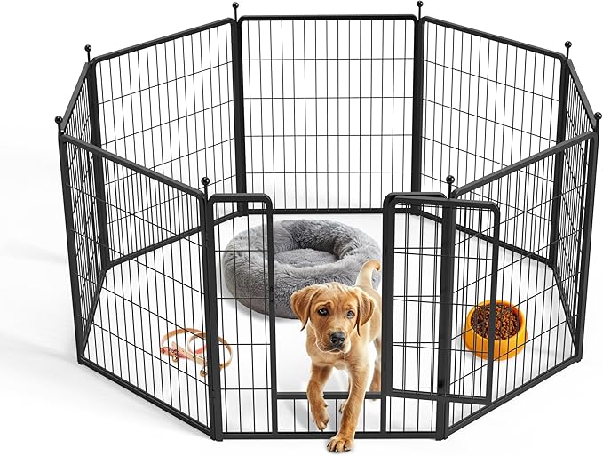• 【Upgraded Dog Playpen】Dog playpen for medium dogs adopts gravity door lock design, much safer and more convenient. Made of heavy duty metal panels and stakes with black coating, non-toxic, anti-rust. Ensures long time use no matter indoor or outdoor.
