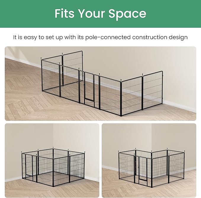 • 【Easy Assemble & DIY Shapes】Each panel is a separate piece. The panels could be assembled in just a few minutes without tools. You could DIY the dog pen to any shape you need, like square, rectangle, round, etc according to your house, garden or lawn.