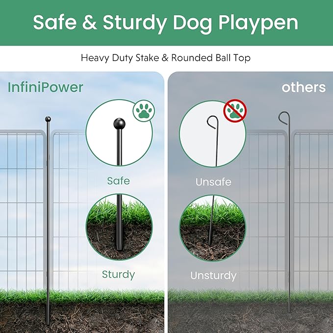 • 【Foldable & Easy to Carry】InfiniPower dog play pen could be disassembled into a flat size for space saving and easy carrying, perfect for travel, RV camping or play in the yard. Dog playpen provides a comfortable and safe space for your small dogs.